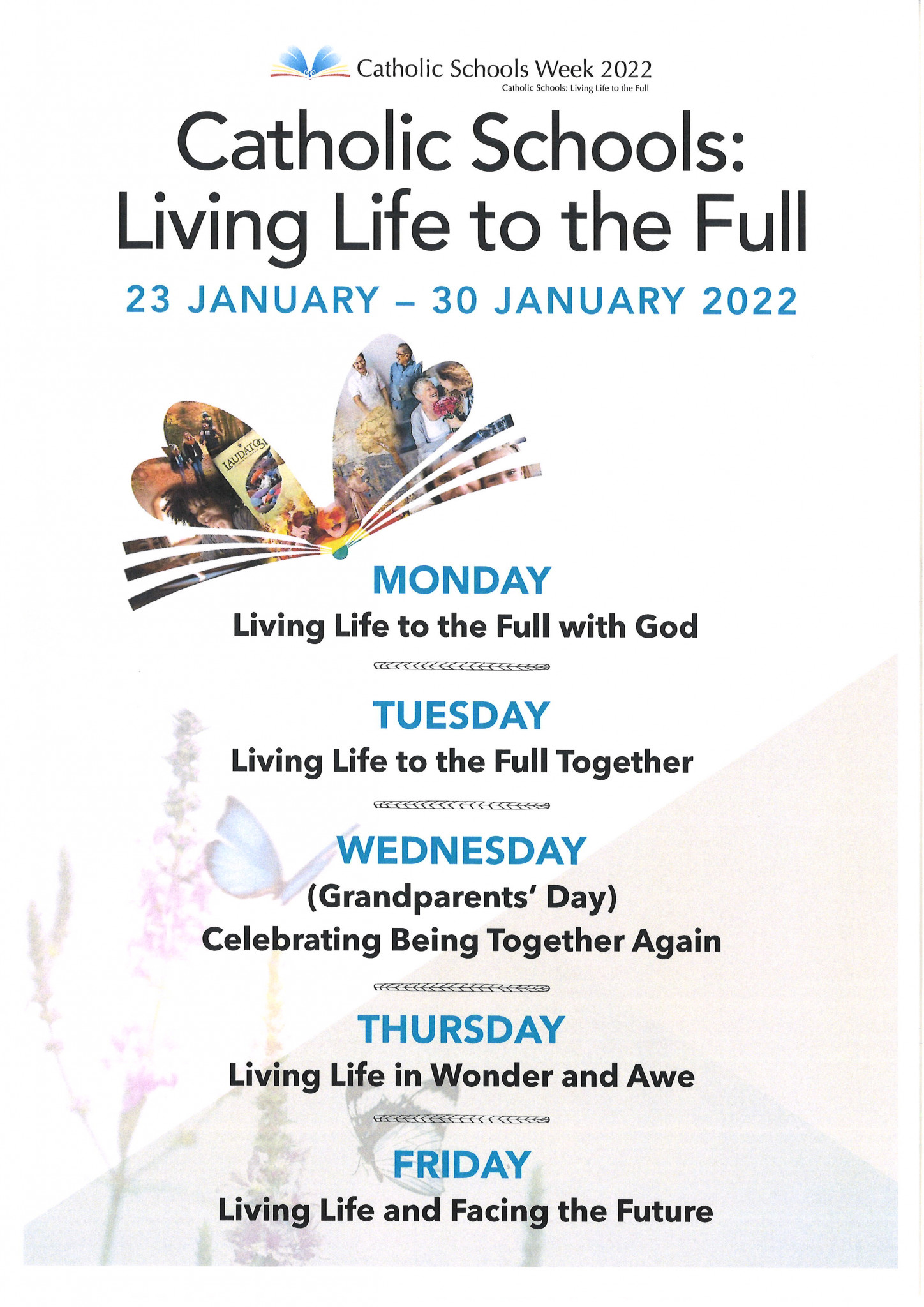 Catholic Schools Week 2022 takes place from January 23rd to January 30th, 2022. The theme of Catholic Schools Week this year is Catholic Schools: Living Life to the Full.