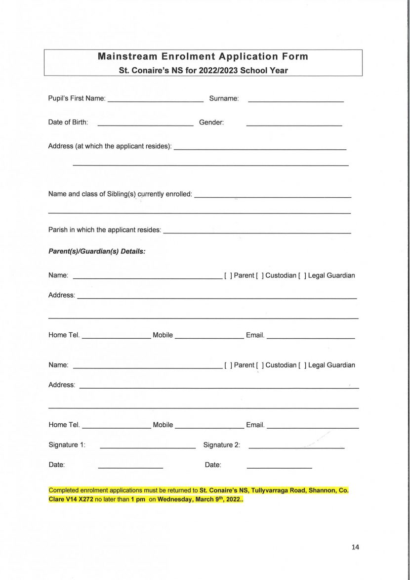 Parents who wish to apply for a place in our Junior Infant Classes for September 2022 may now submit a completed application form to the school on or before February 23rd, 2022.  Forms are available from the school office at 061 364694 or can be downloaded here:  Junior Infant Enrolment Application Form September 2022