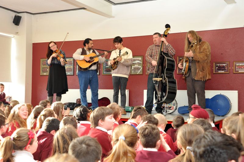 American bluegrass band Jeff Scroggins and Colorado visited St. Conaire’s recently during their tour of Ireland. The five piece band played two sets for the pupils. 2nd to 6th class pupils were treated to an electrifying displaying of playing and singing. This concert gave pupils a chance to understand a different genre of music and engage with a live band. Bluegrass music has its roots in the Appalachian Mountains of the eastern US and this was explained to the audience by band leader Jeff Scroggins. Junior Infants to First Classes then got to see an amended set and were equally enthralled by the great playing, singing and interaction with the audience. Teacher Mr. Pilkington joined the band on stage and led the pupils and teachers in singing for Jeff and his band. The school choir with Ms. Cleary and Ms. White also performed for the audience. It was a lovely visit and we thank Mr. O’Brien, John Nyhan and the band for taking the time to come to St. Conaire’s. Many thanks to Mr. O’Brien for arranging the event. A warm word of thanks goes to John O’Brien of O’Brien Photography Bunratty for the lovely pictures. Click here to see a gallery of photographs of the concert.