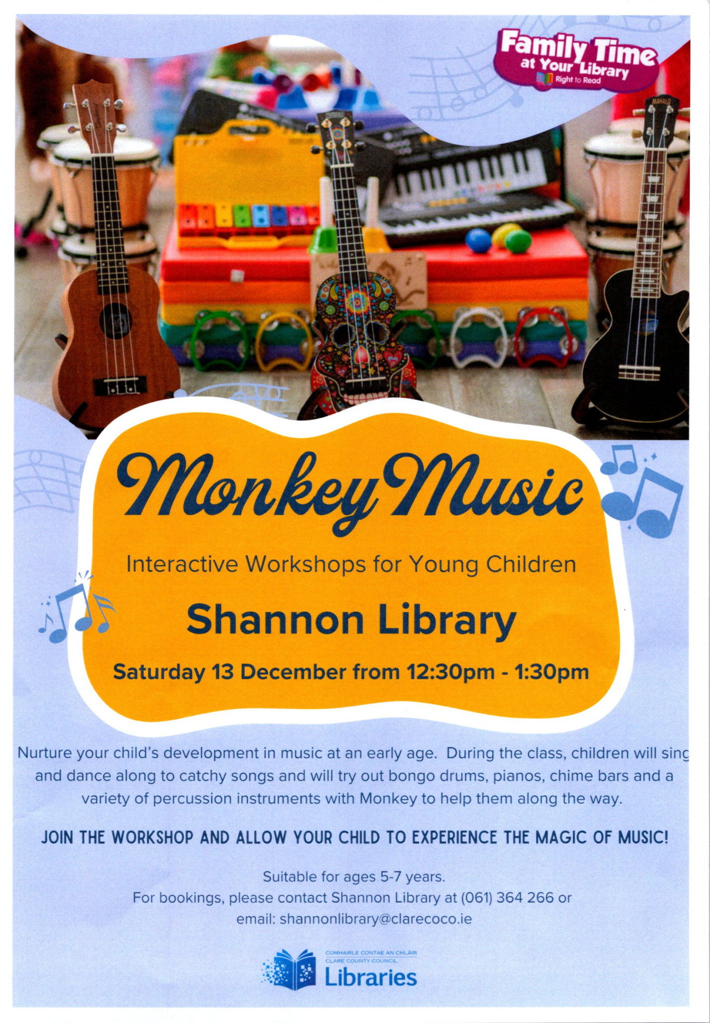Shannon Library invites all 5 to 7 year olds to their interactive "Monkey Music" Workshops on Saturday, December 13th from 12:30 pm to 1:30 pm. During the event, children will […]