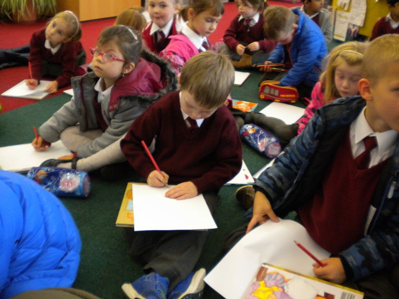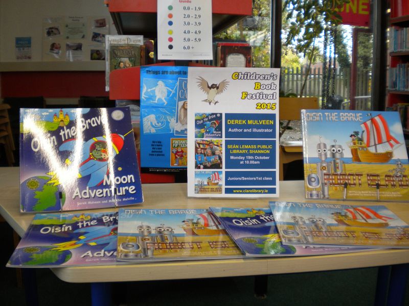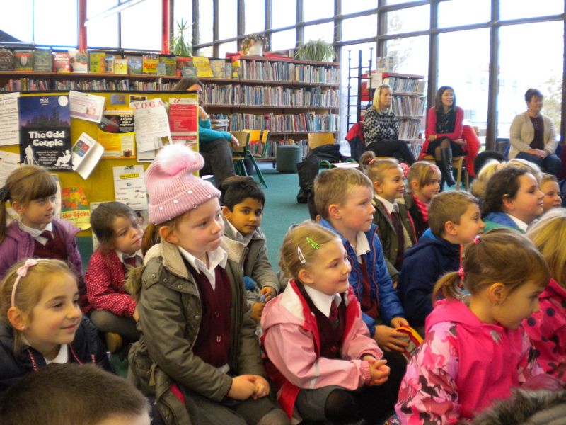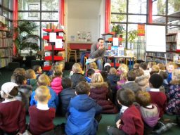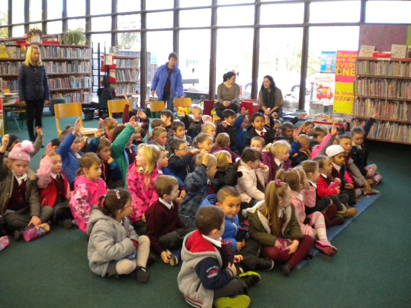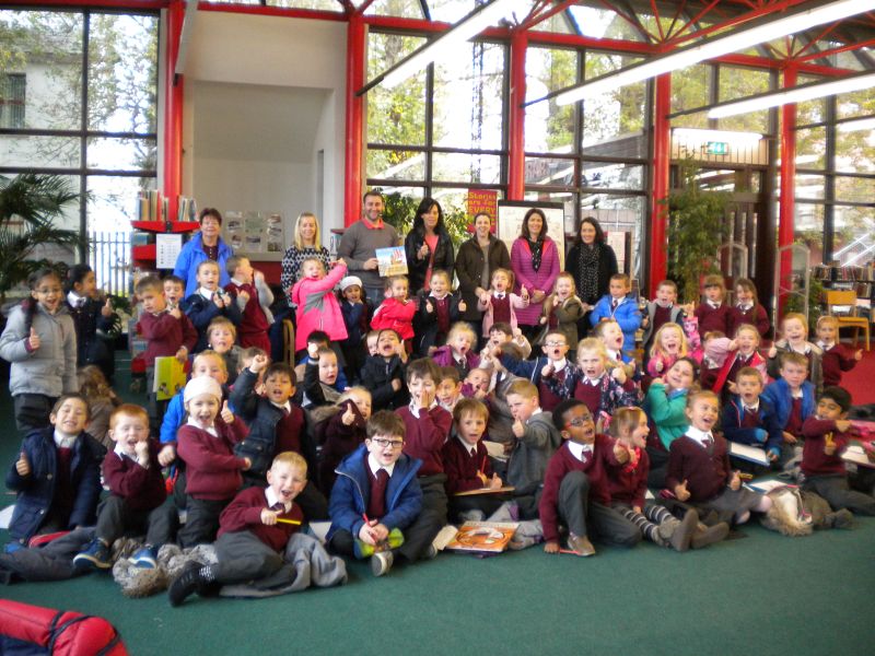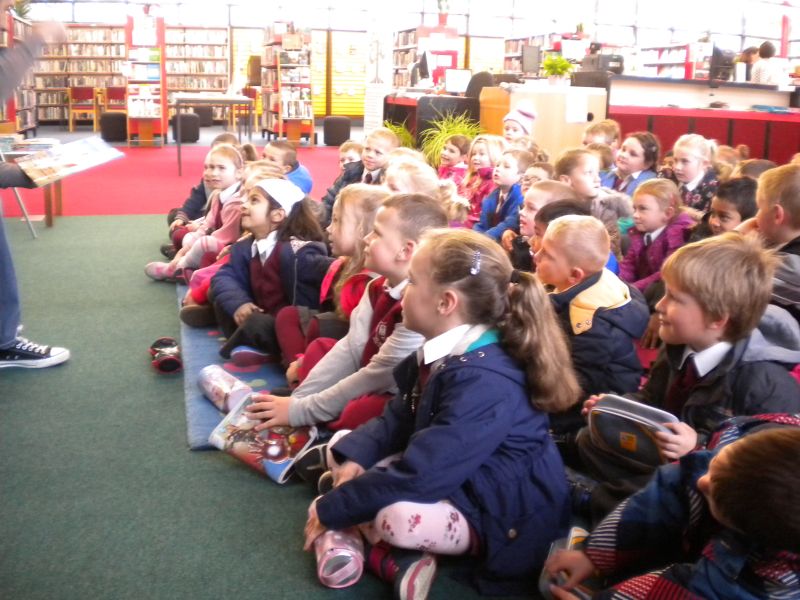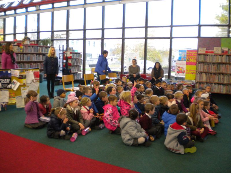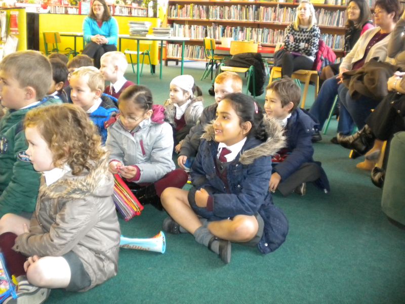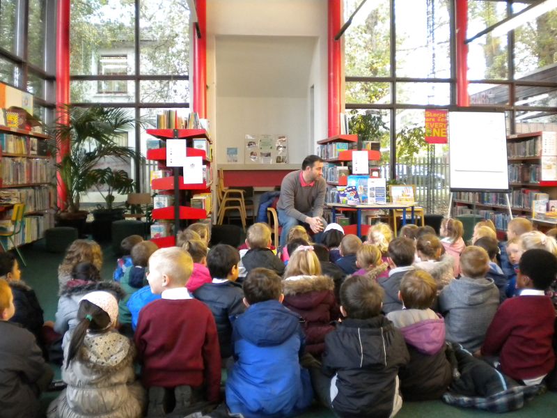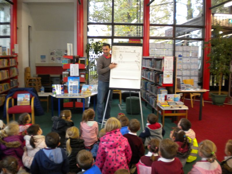 The three Senior Infant Classes walked to Seàn Lemass Library on October 19 2015 to see author/illustrator Derek Mulveen talk about his book OisÕn the Brave – Moon Adventure.