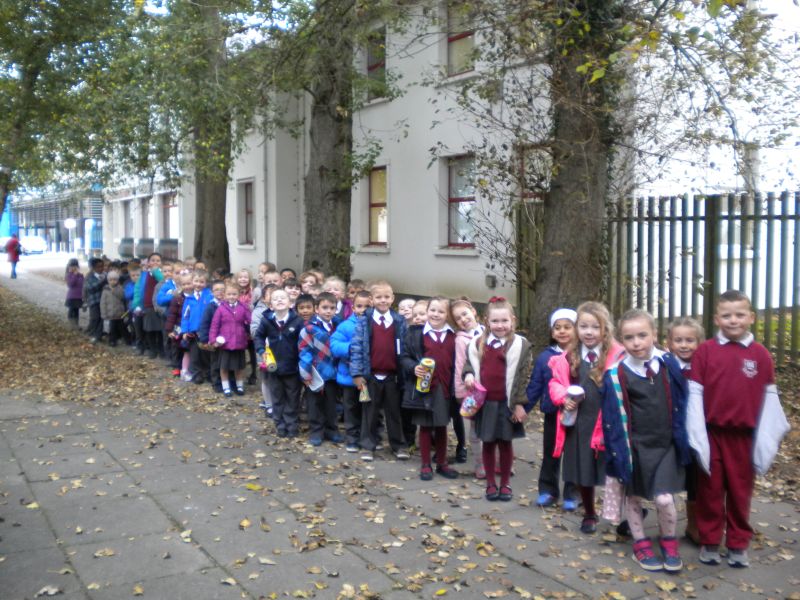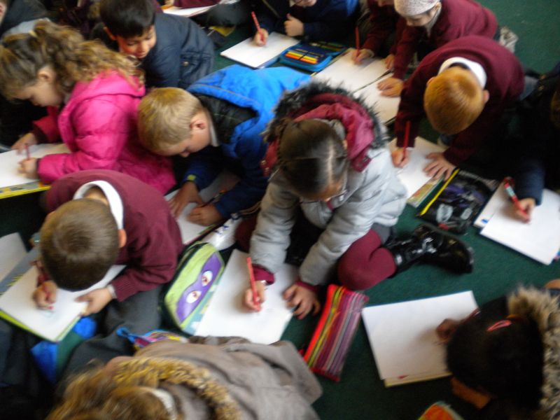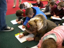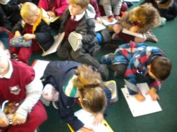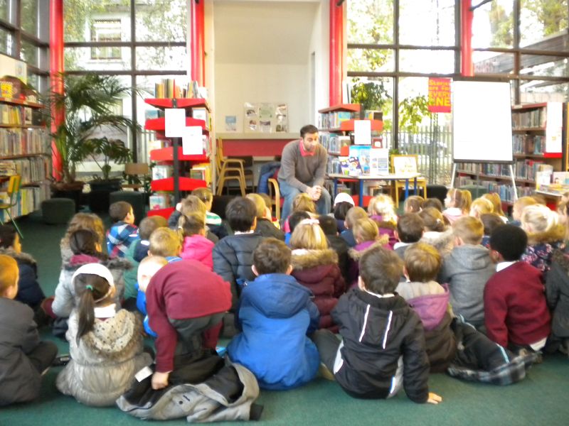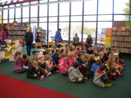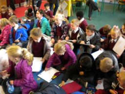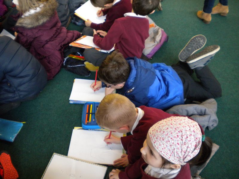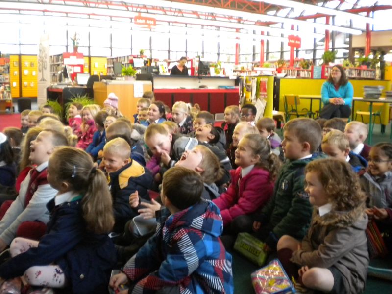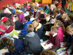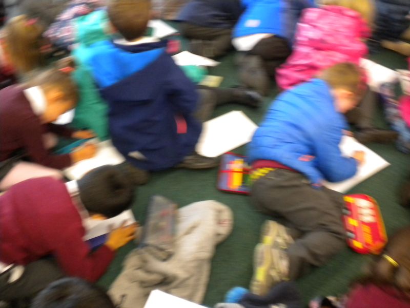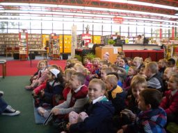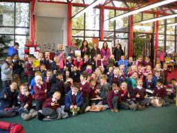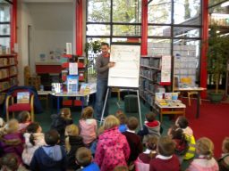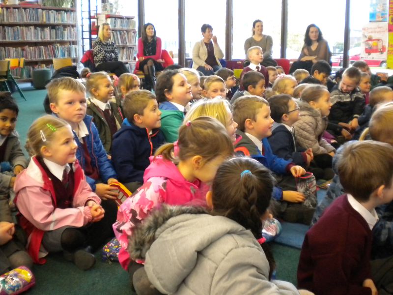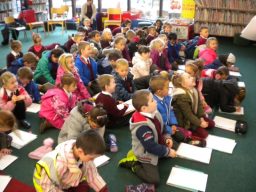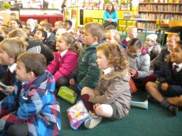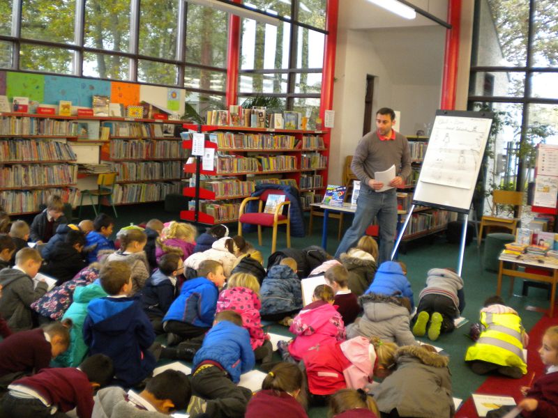 The three Senior Infant Classes walked to Seàn Lemass Library on October 19 2015 to see author/illustrator Derek Mulveen talk about his book OisÕn the Brave – Moon Adventure.
