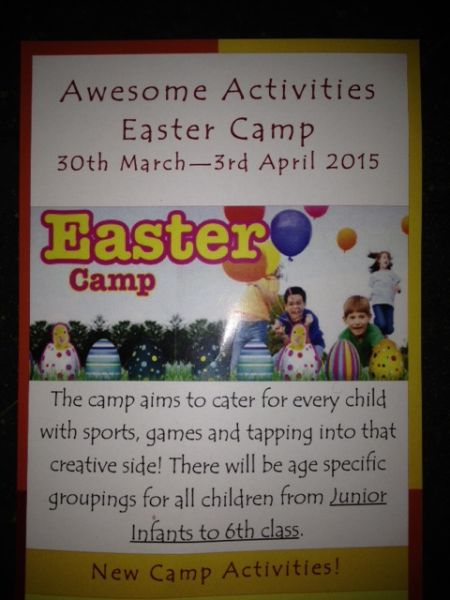 The Awesome Activities Easter Camp will run during the first week of the 2015 Easter Holidays.  This camp aims to provide children with a wide range of different fun activities.  There will be age-specific groupings for all children from Junior Infants to 6th Class.  Please direct any queries to Mr. Glynn at the following e-mail address:  awesomeactivitycamp@gmail.com