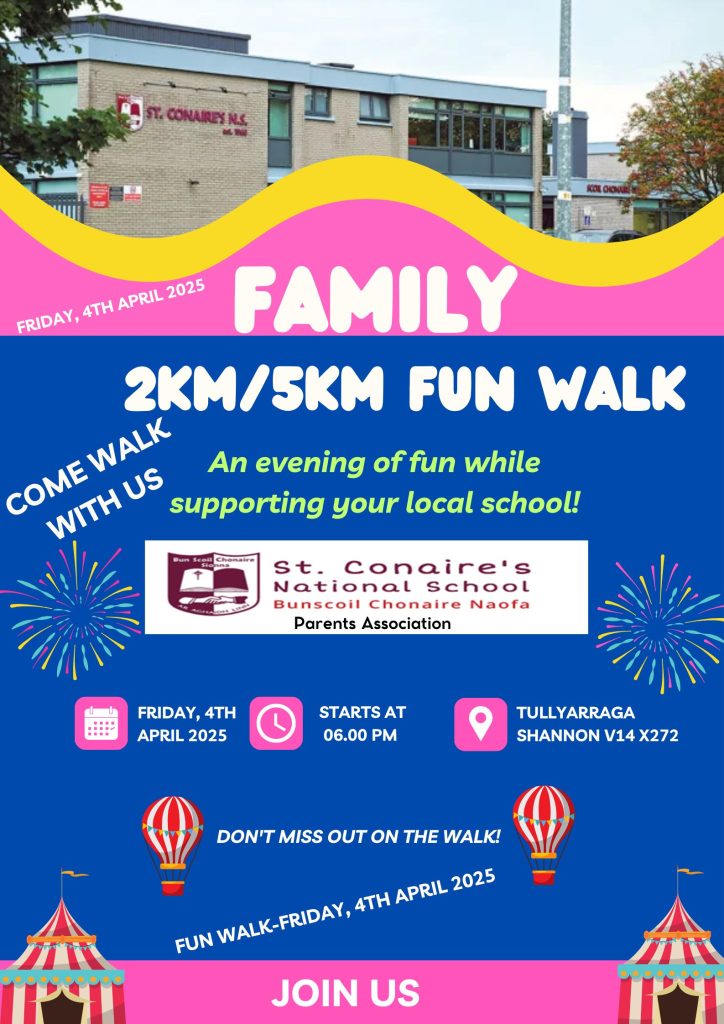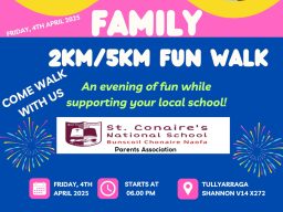 Our annual Parent Association Family Fun Walk takes place on Friday, April 4th 2025 at 6 pm. The theme this year is Crazy Hair! All funds raised go towards providing support to the work of the school. This year alone, the Parent Association has funded the fencing on our school astro pitch along with specialised play equipment and general sports equipment for all pupils on yard. We are so very fortunate to have a brilliantly supportive Parent Association in St. Conaire’s NS who do so much work behind the scenes. We thank all parents and sponsor for their great help and we hope everyone has an enjoyable time. Go raibh míle maith agaibh!