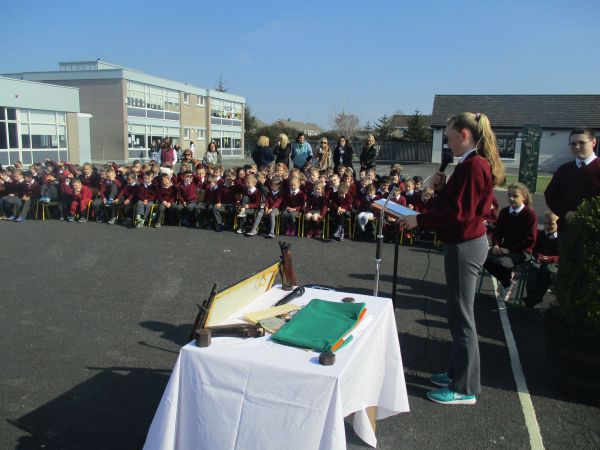 March 15 2016 was Proclamation Day.  St. Conaire’s N.S. marked the day with a special ceremony in our school garden.  Over 500 pupils, staff and visitors took part in the event.  Our Tricolour was presented to the school by the Defence Forces earlier this year.  A new flagpole was installed as a centre-piece in the garden.  Pupils have been learning about the significance of our national flag, the Proclamation from Easter 1916 and the Easter Rising.  Pupils from the Student Council read the 1916 Proclamation to the gathered assembly.