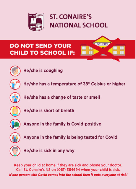 St. Conaire’s has produced clear guidelines for parents about when to keep a child at school if they are sick or showing any Covid symptoms.  This guidance follows HSE and Department of Education procedures.  A quick reference guide will be sent home with all children.  All parents are required to follow this guidance fully in the interests of keeping everyone safe.
