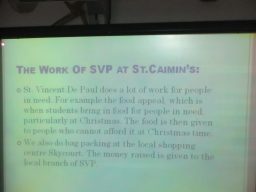 Our 6th classes were visited by the St. Vincent de Paul Chapter from St. Caimin’s Community School on Monday, January 30th 2017. The second level students made a presentation about their work in the context of Catholic Schools Week 2017.