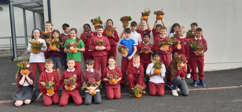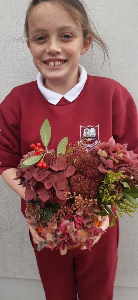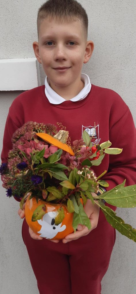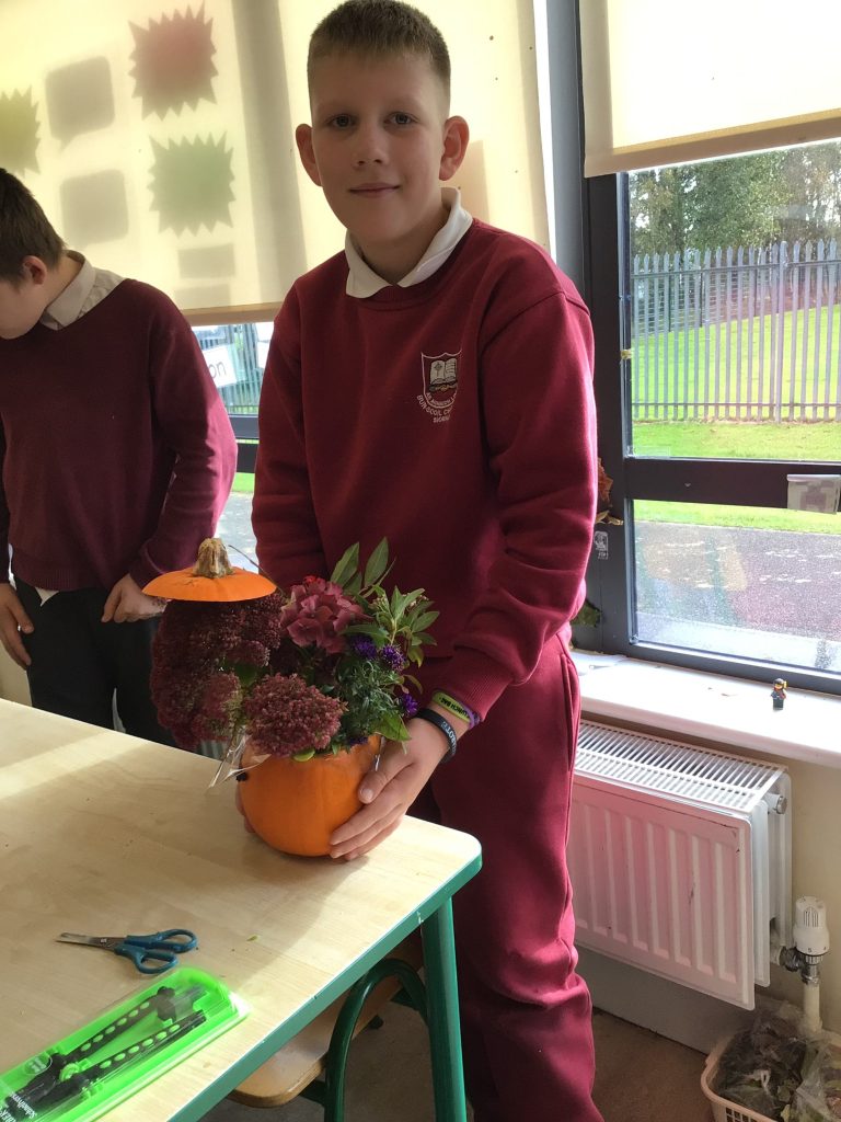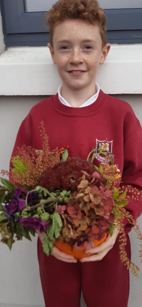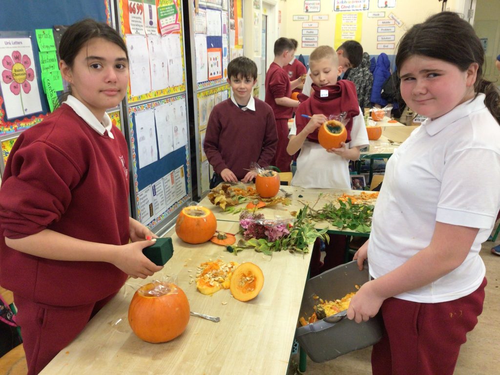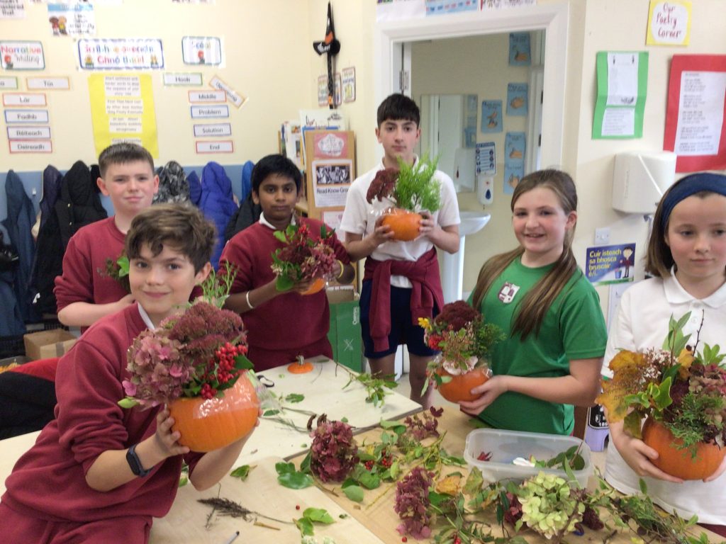 Ms. Greene and Mrs Glynn made fabulous pumpkin vases this week with 5th class.  They used all local materials and came up with brilliant individual vases.  The children worked together and learned all about the valuable skills of communication and collaboration.  Our TY student Liam also helped out.  Well done to everyone involved!  Maith sibh!