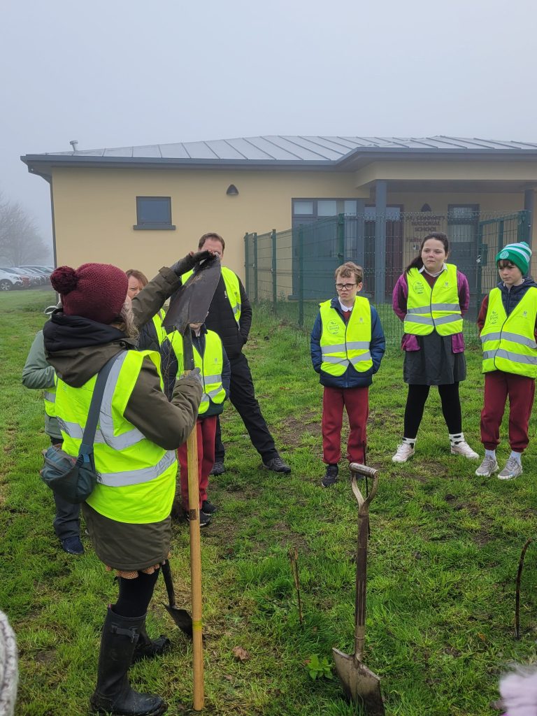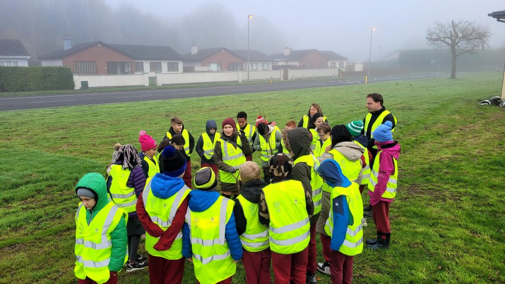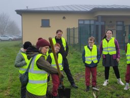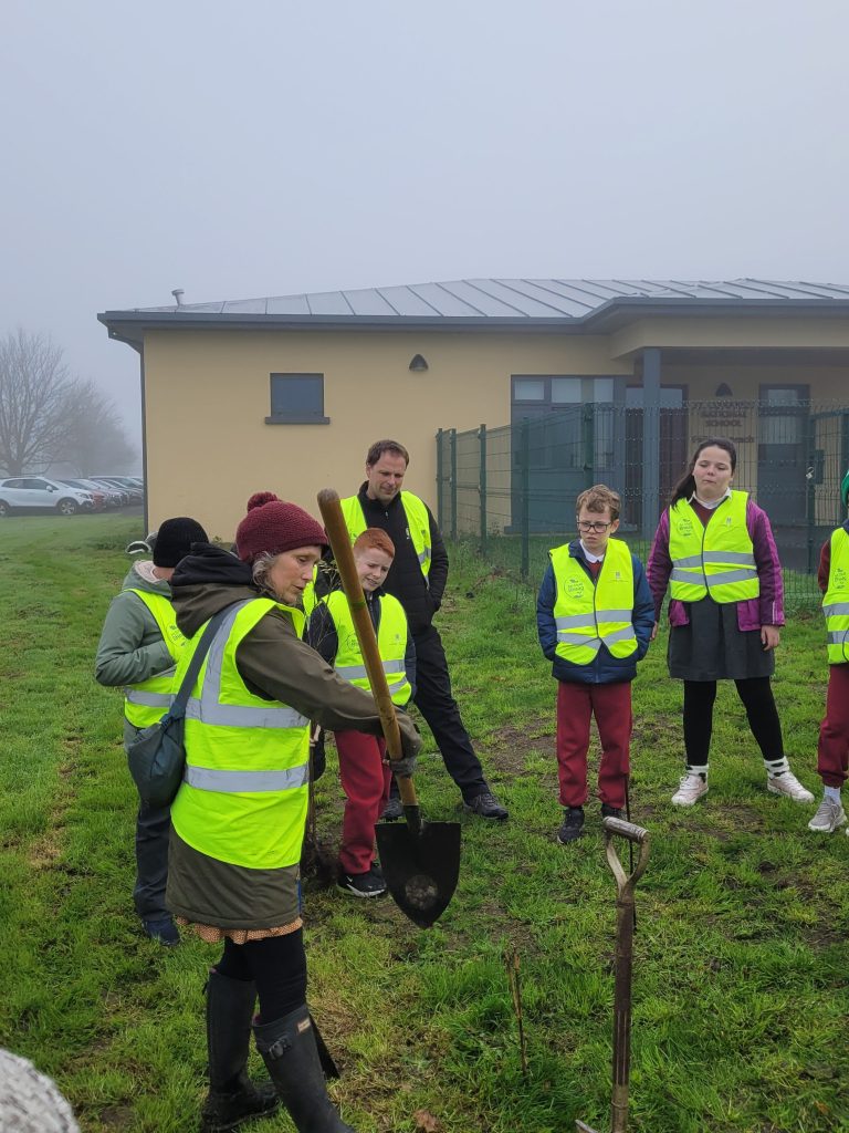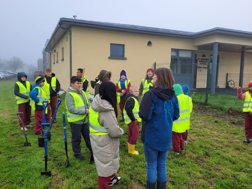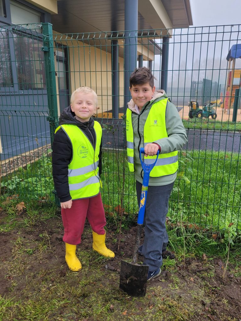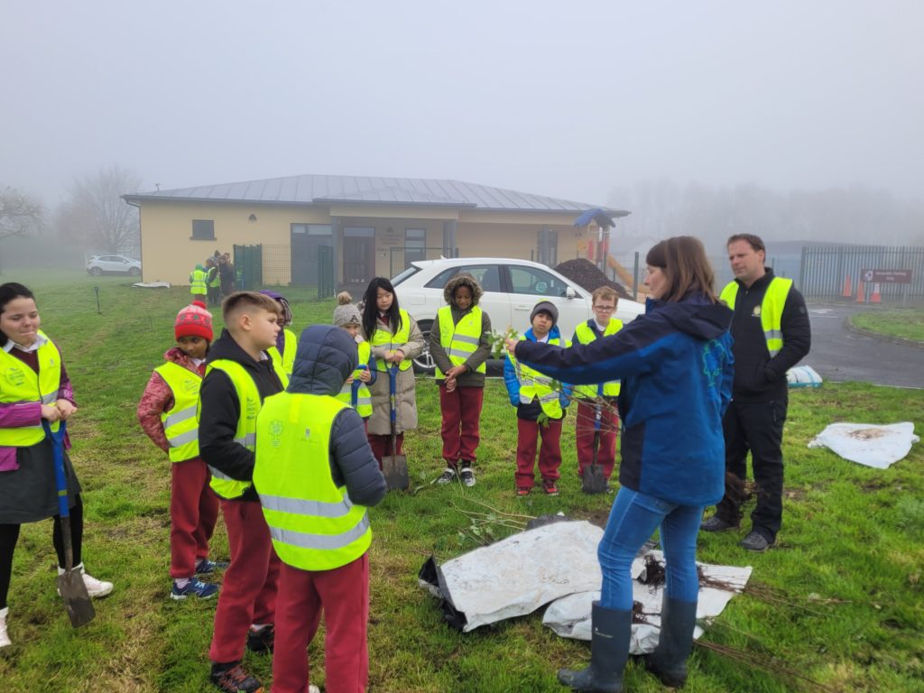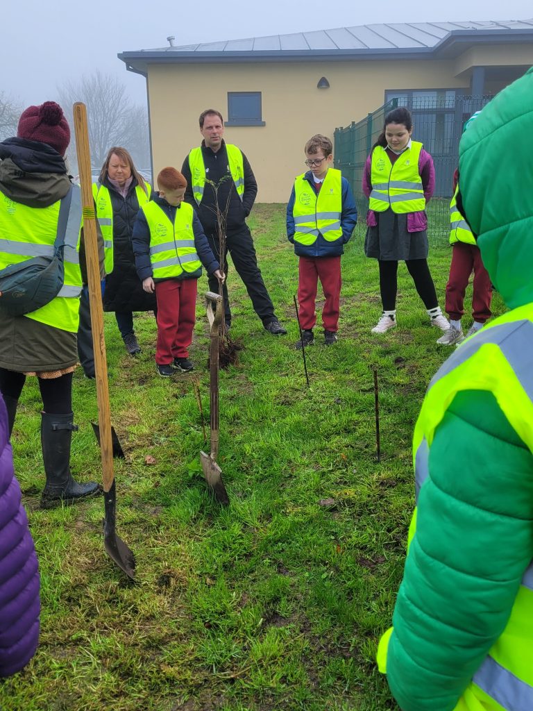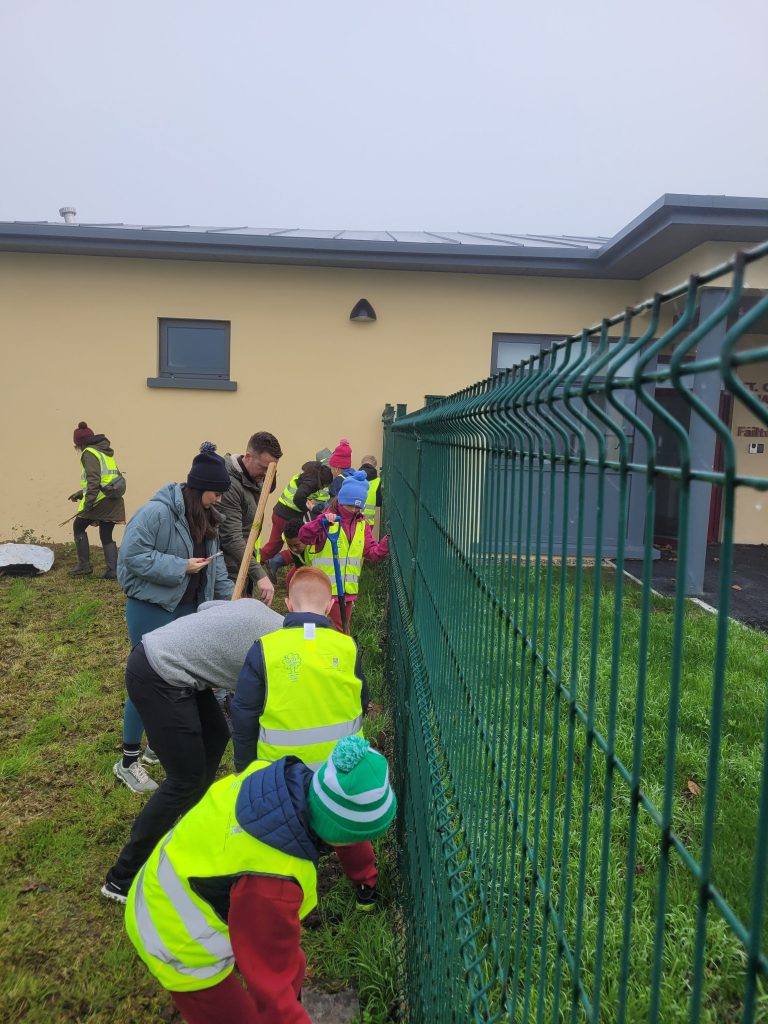St. Conaire’s was delighted to welcome our friends from Shannon Technical Services (STS) to assist us in planting the native Irish trees for our An Choill Bheag project. The day was cold and foggy but Mr. McNamara’s and Múinteoir Irene/Siobhán class took to the work very well. Guided by Niamh and Rachel from LEAF (Learning About Forests), the children and friends from STS planted over 170 mixed native species on ground near our ASD class. The aim of this project is to create a small native biodiverse woodland area which can be used as an outdoor classroom. The children will be putting in mulch on the next day Niamh and Rachel visit.