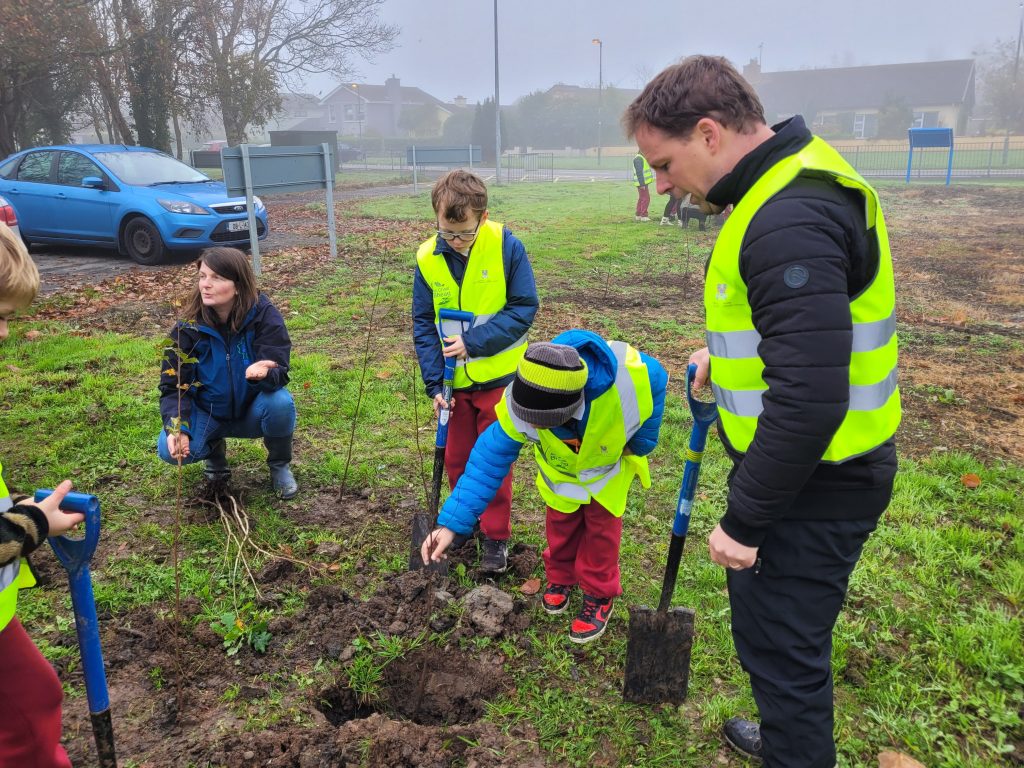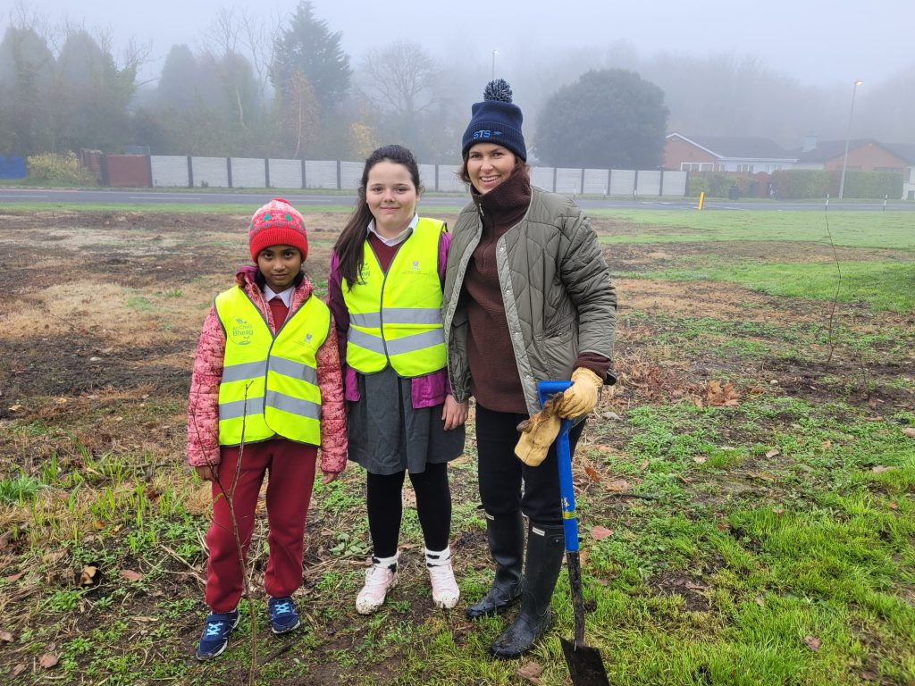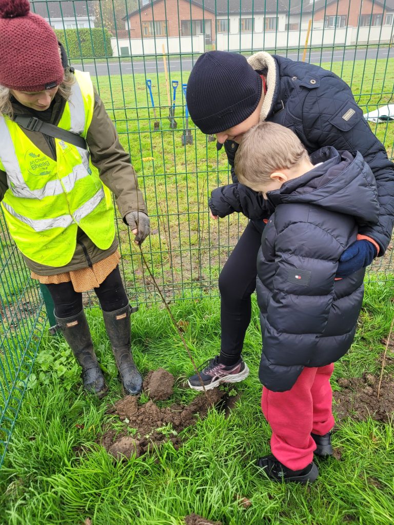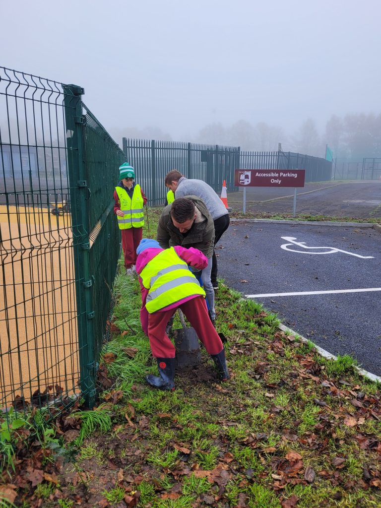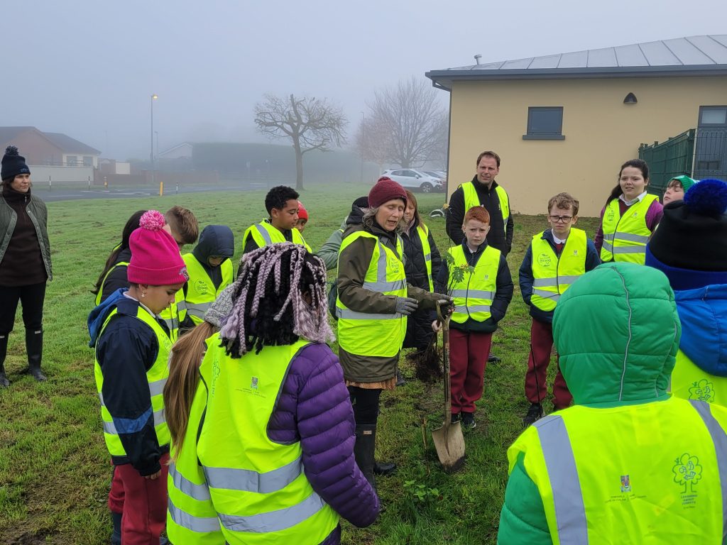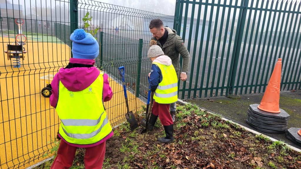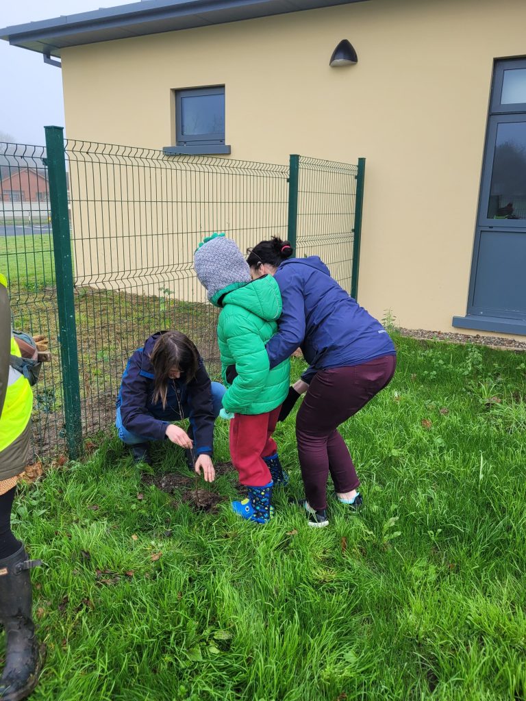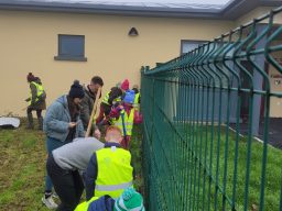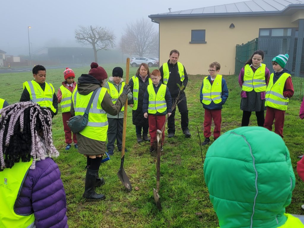 St. Conaire’s was delighted to welcome our friends from Shannon Technical Services (STS) to assist us in planting the native Irish trees for our An Choill Bheag project. The day was cold and foggy but Mr. McNamara’s and Múinteoir Irene/Siobhán class took to the work very well. Guided by Niamh and Rachel from LEAF (Learning About Forests), the children and friends from STS planted over 170 mixed native species on ground near our ASD class. The aim of this project is to create a small native biodiverse woodland area which can be used as an outdoor classroom. The children will be putting in mulch on the next day Niamh and Rachel visit.